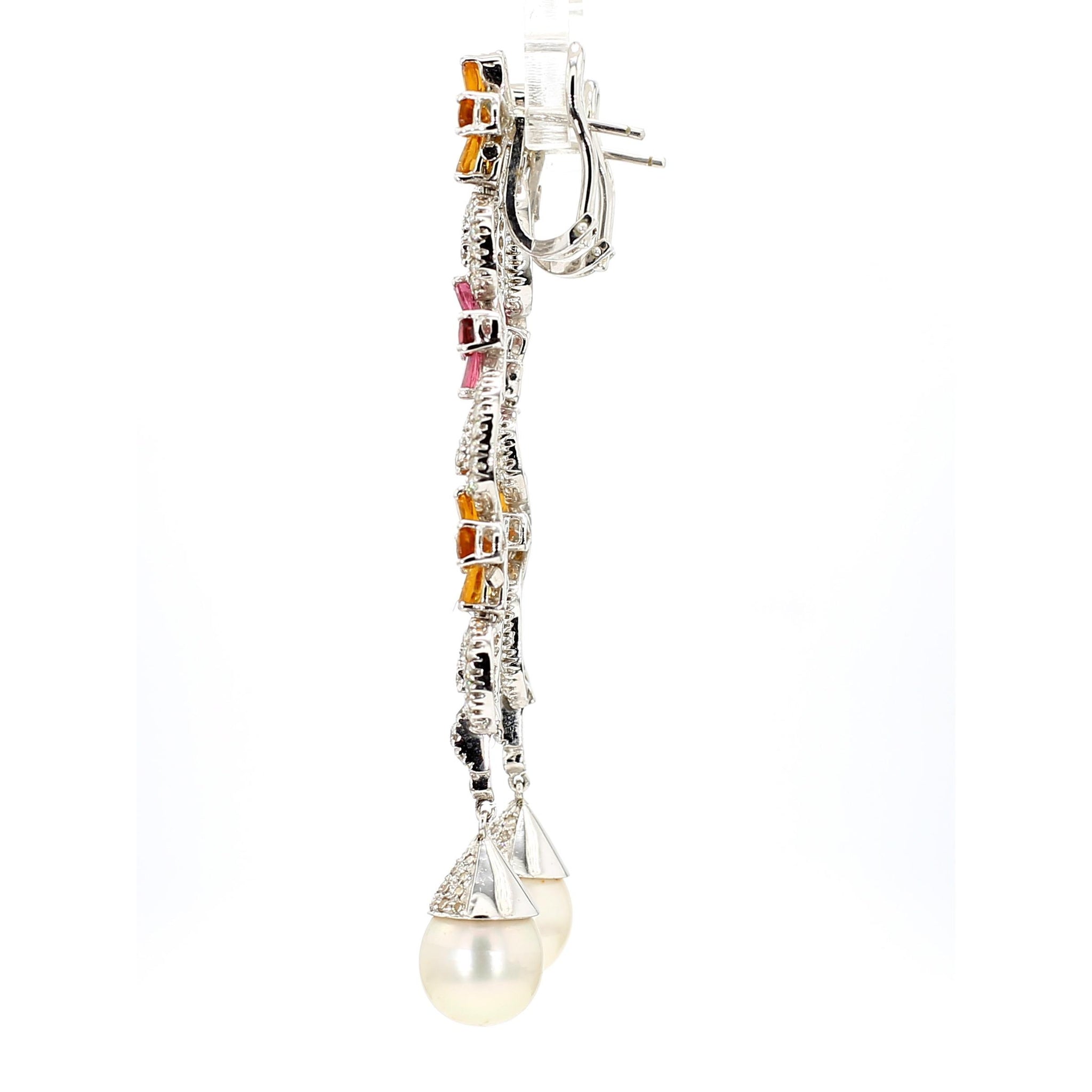 Intricate woven floral motifs create dimensional lattice patterns entirely pave-set with 12 carats of near-colorless E-F diamonds throughout both pieces, providing continuous sparkle and brilliance. The earrings feature graduated floral elements descending 3 inches, punctuated with alternating pink tourmalines and yellow garnets in prong settings, terminating in 11mm South Sea pearl drops that add elegant movement. The matching lariat necklace presents an 18-inch chain composed of interconnected floral links with 32 pink tourmalines and 32 yellow citrines strategically placed throughout, extending into a 3-inch adjustable lariat drop for versatile styling options. The 18K white gold construction provides neutral backdrop that enhances the pastel pink and warm yellow gemstone colors while the micro-pave diamond work creates texture and dimension across every surface.