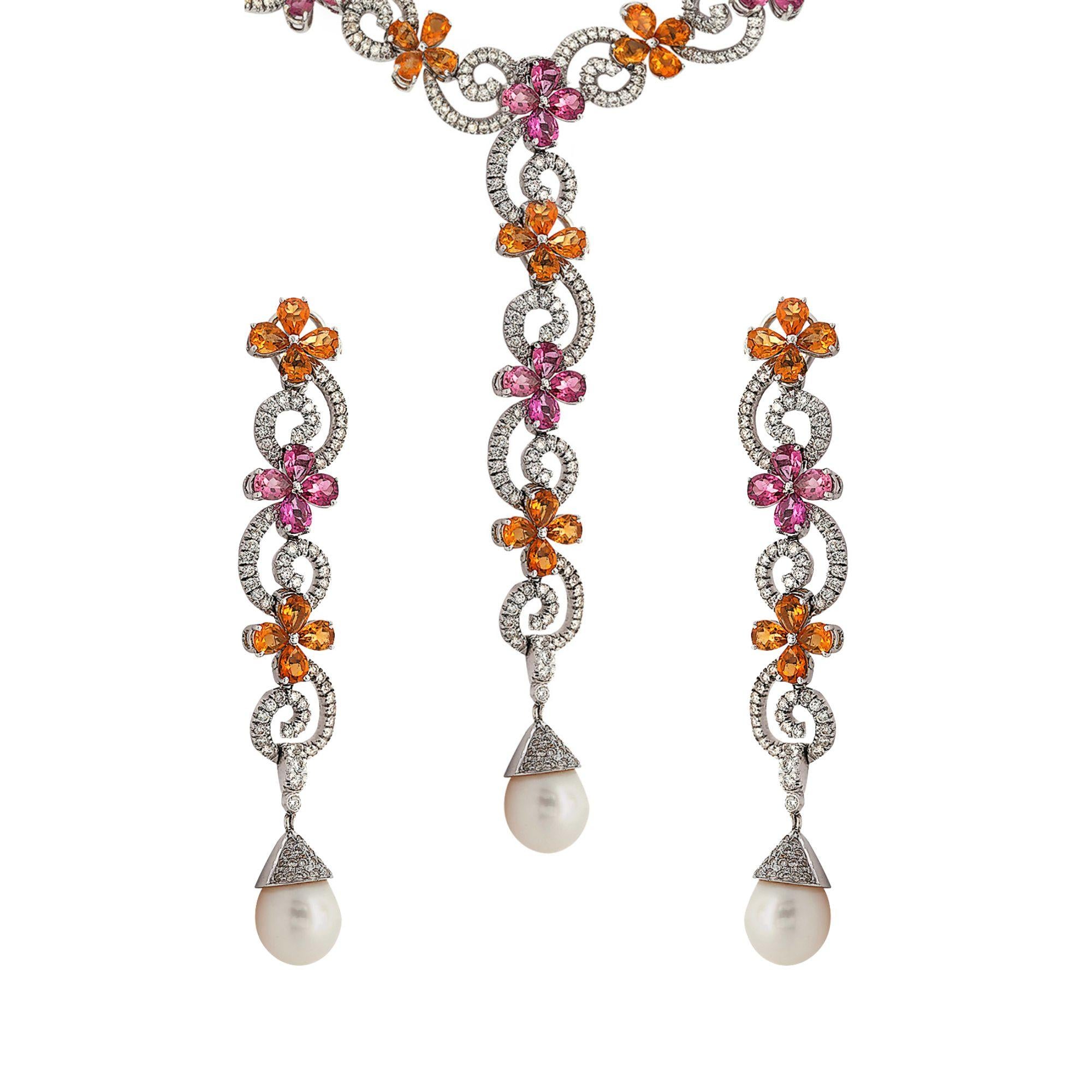 Greek-made jewelry set featuring woven floral motif in 18K white gold with 12 carats of diamonds, South Sea pearls, pink tourmalines, and yellow citrines. Earrings measure 3 inches with pearl drops, necklace features 18-inch chain with 3-inch lariat extension, total weight 103 grams.