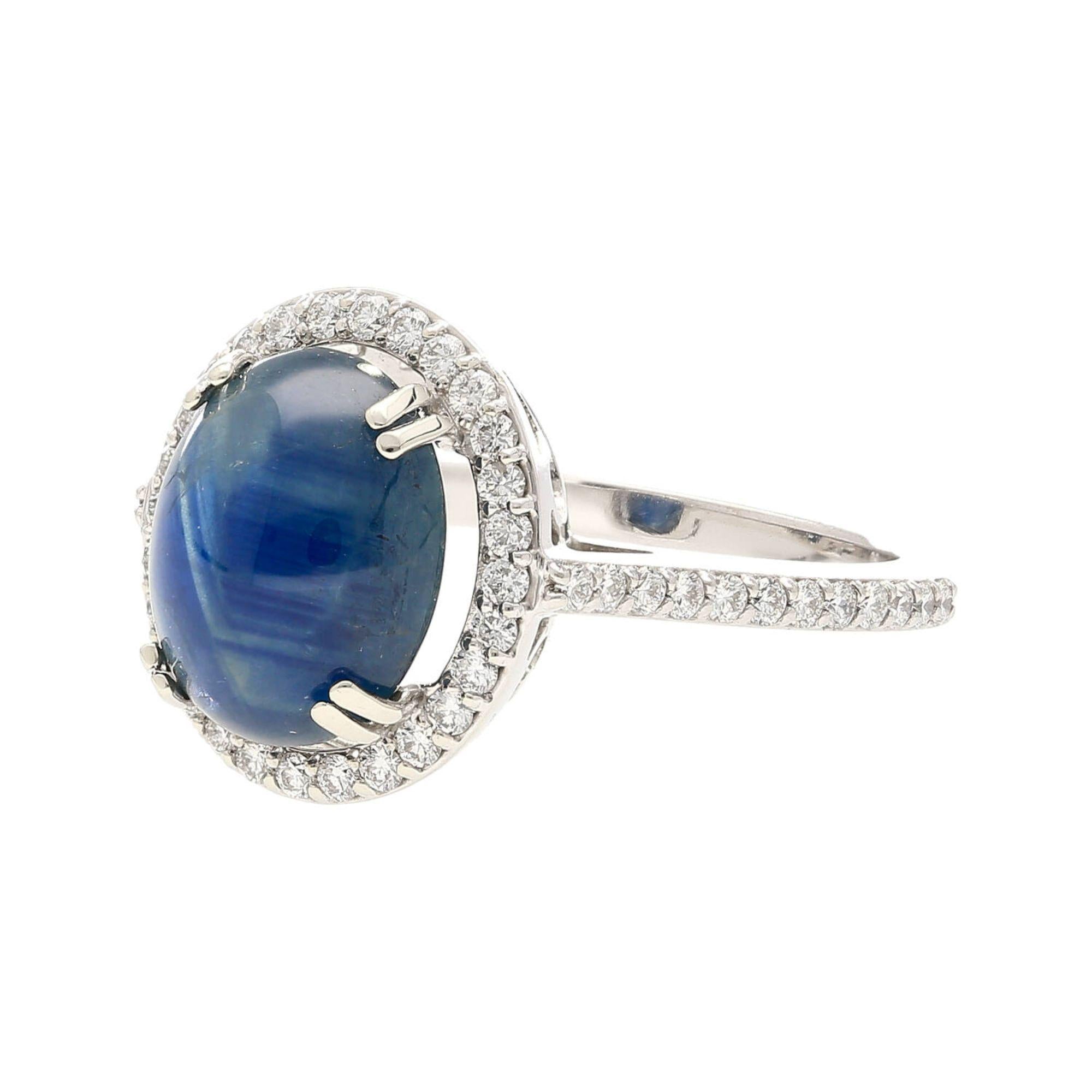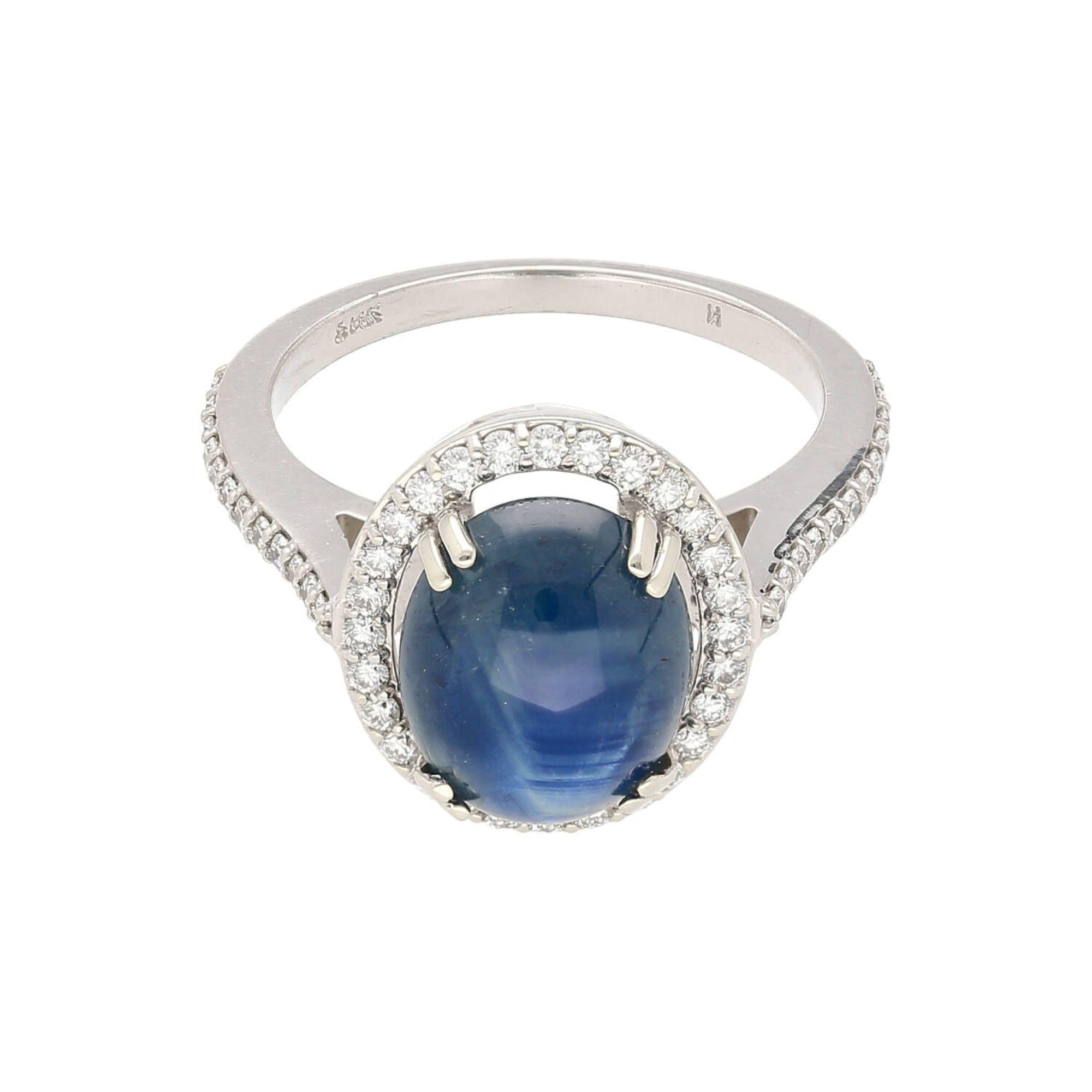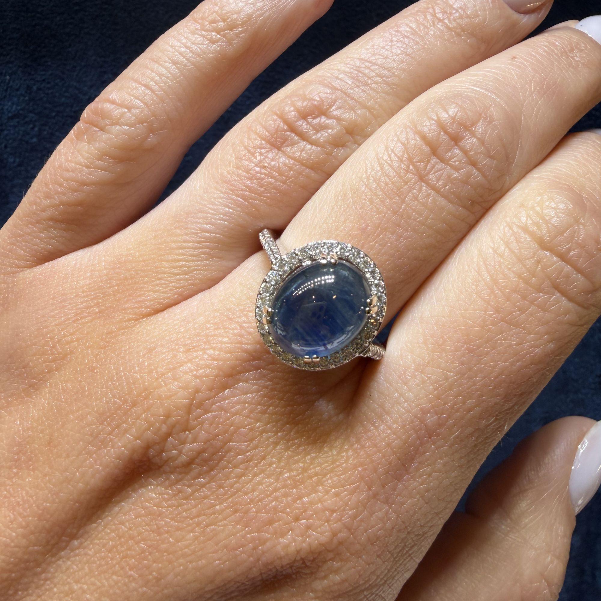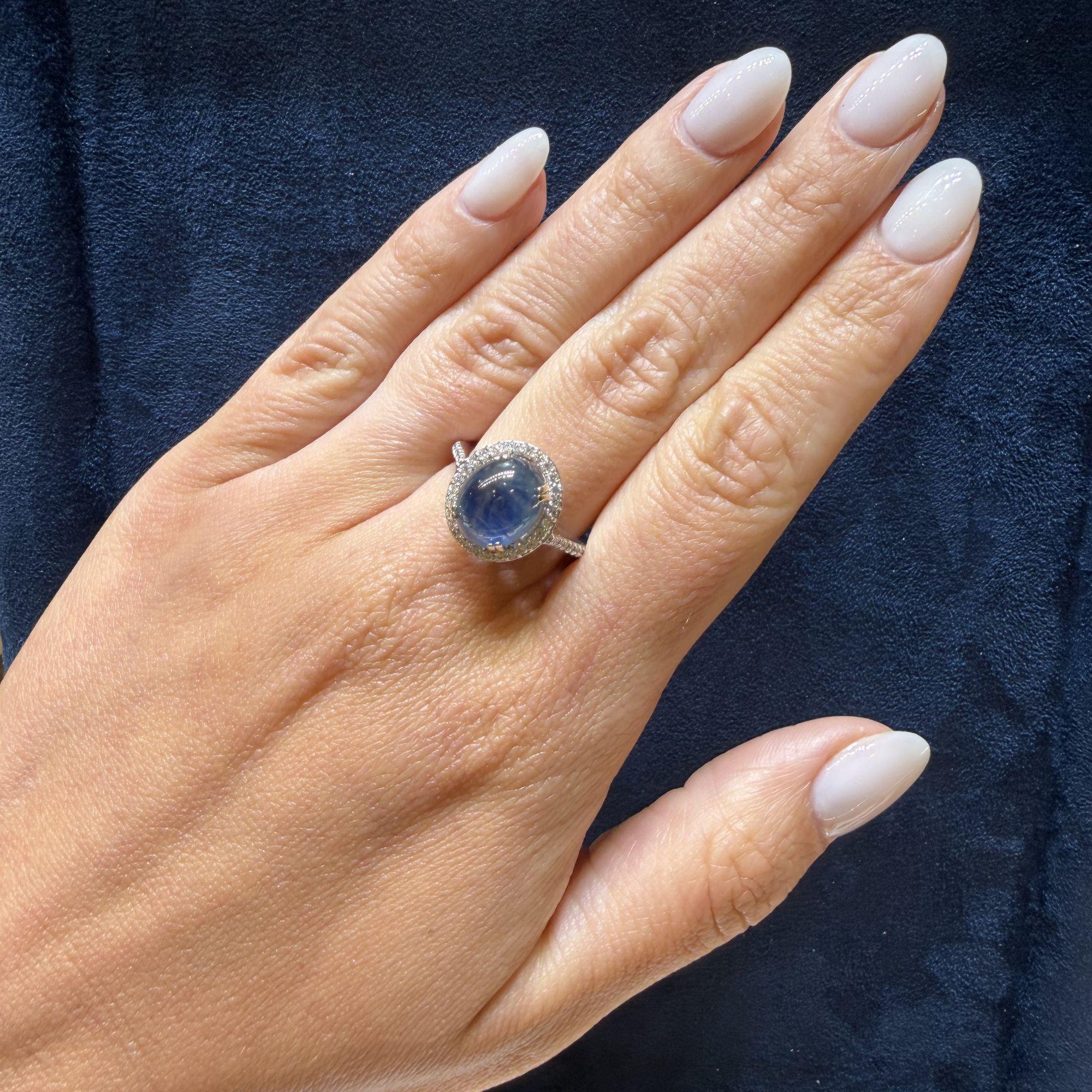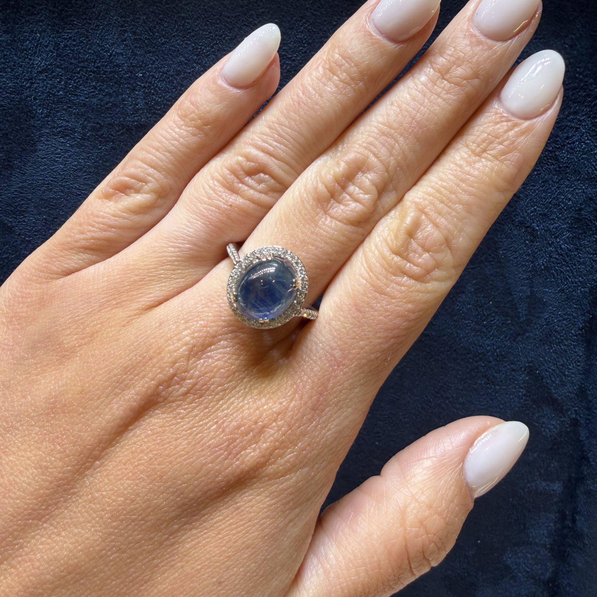 The 14K white gold setting features a four-prong basket that raises the oval cabochon star sapphire above a continuous oval halo of pave-set round brilliant diamonds that perfectly trace the outline of the center stone. The slim pave diamond shank flows seamlessly into the halo frame, extending the diamond coverage down the band for a polished, cohesive look. The all-white gold construction allows the deep blue of the sapphire and the bright sparkle of the diamonds to express themselves fully without visual interference from warm-toned metal.