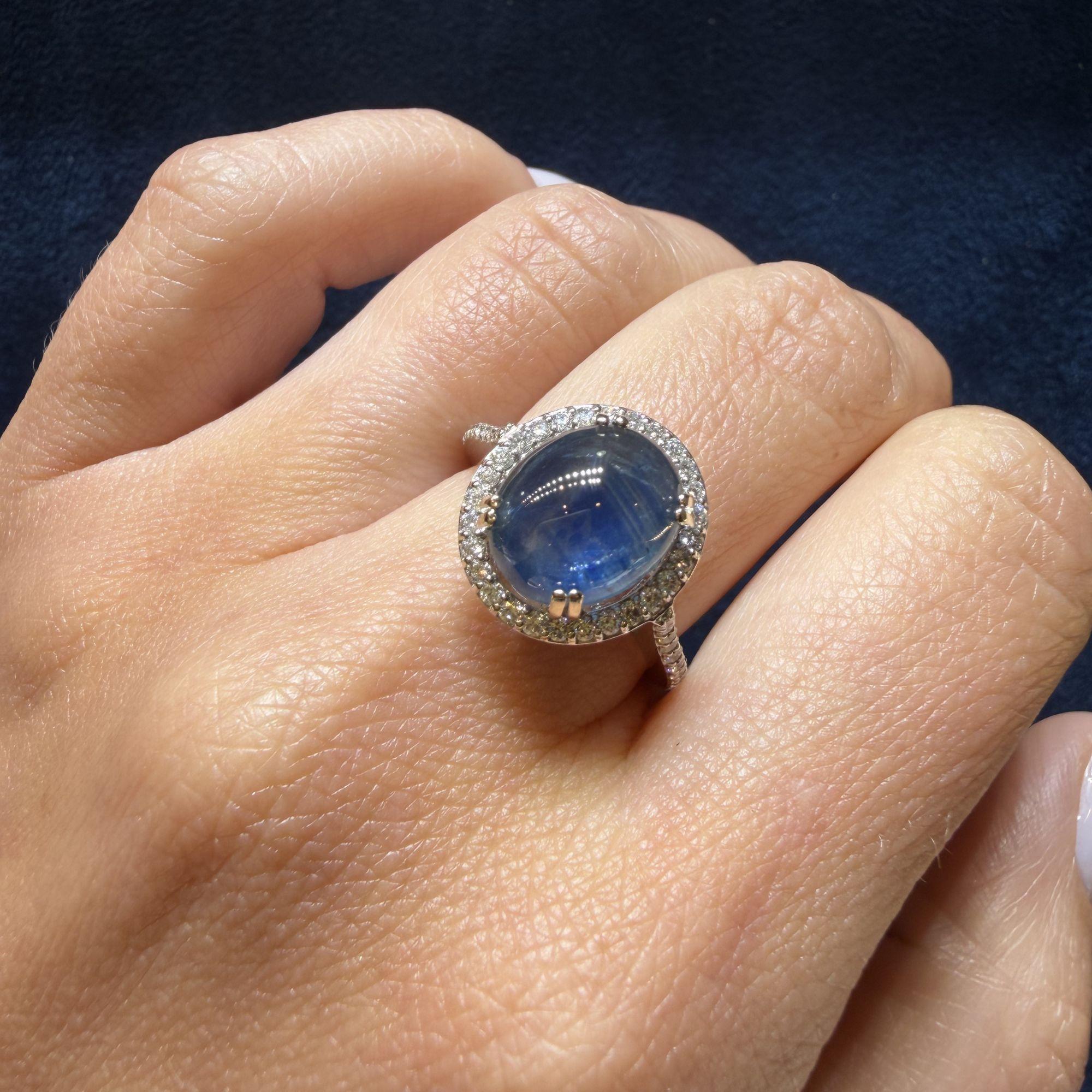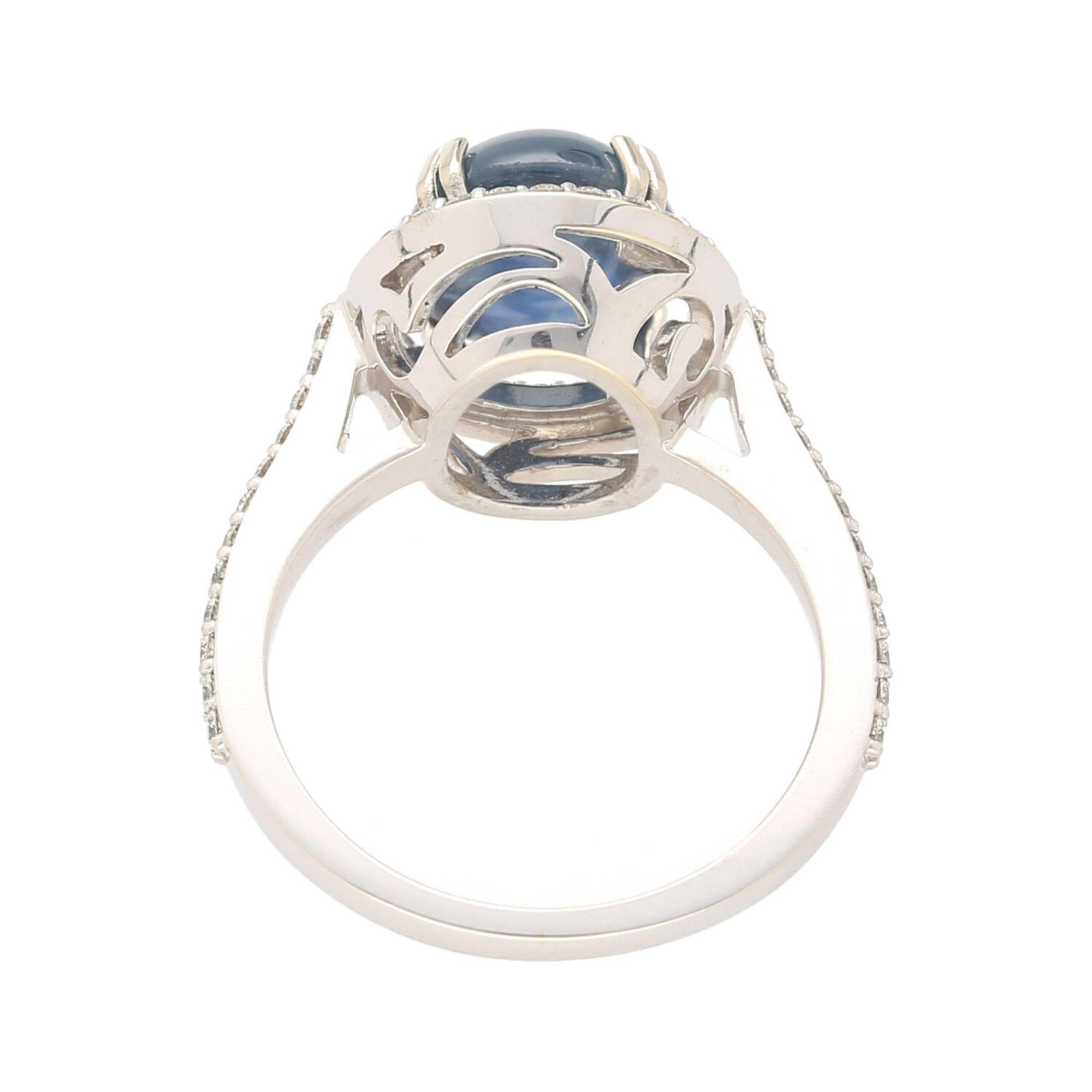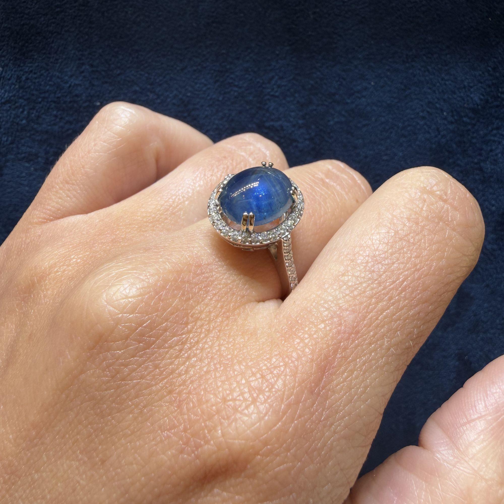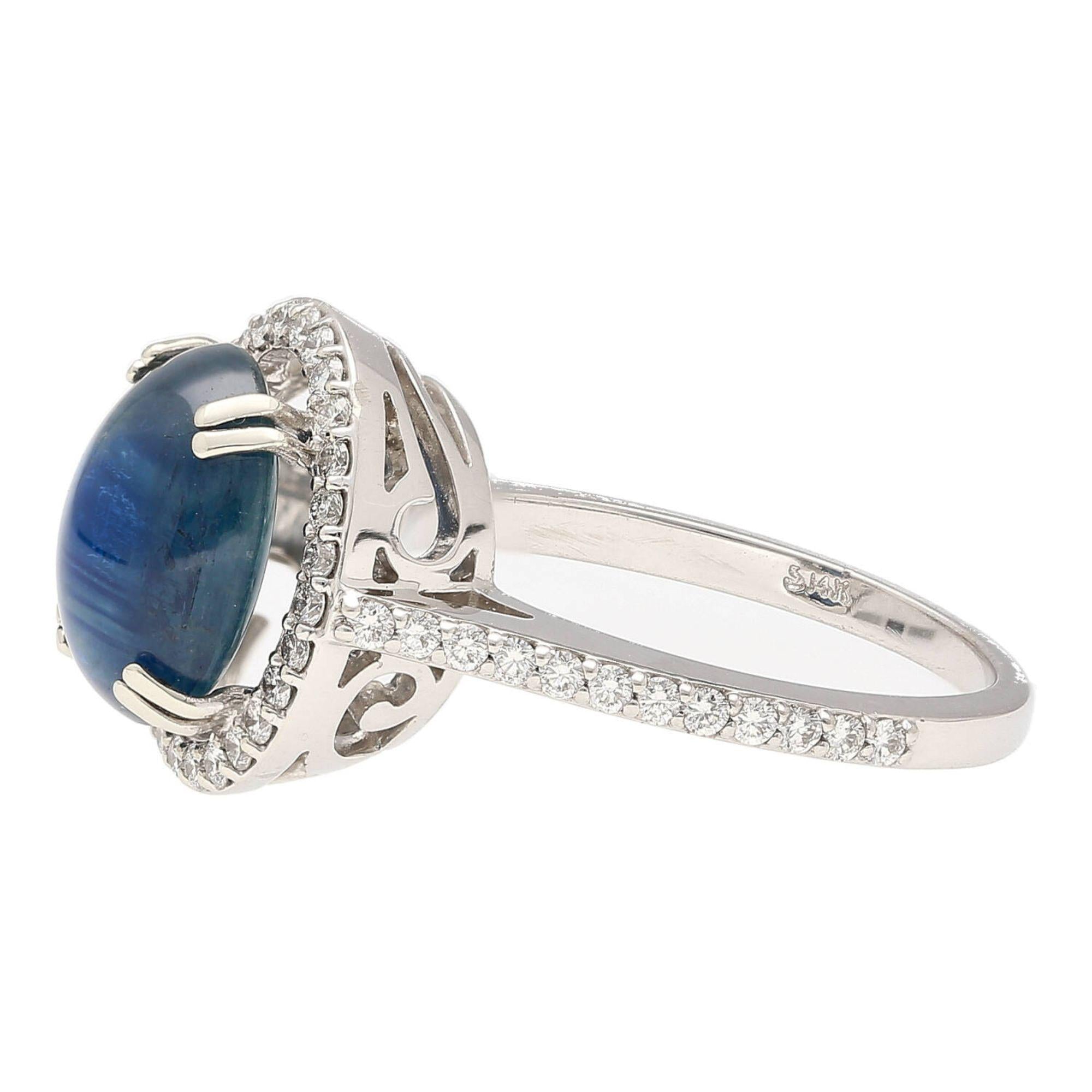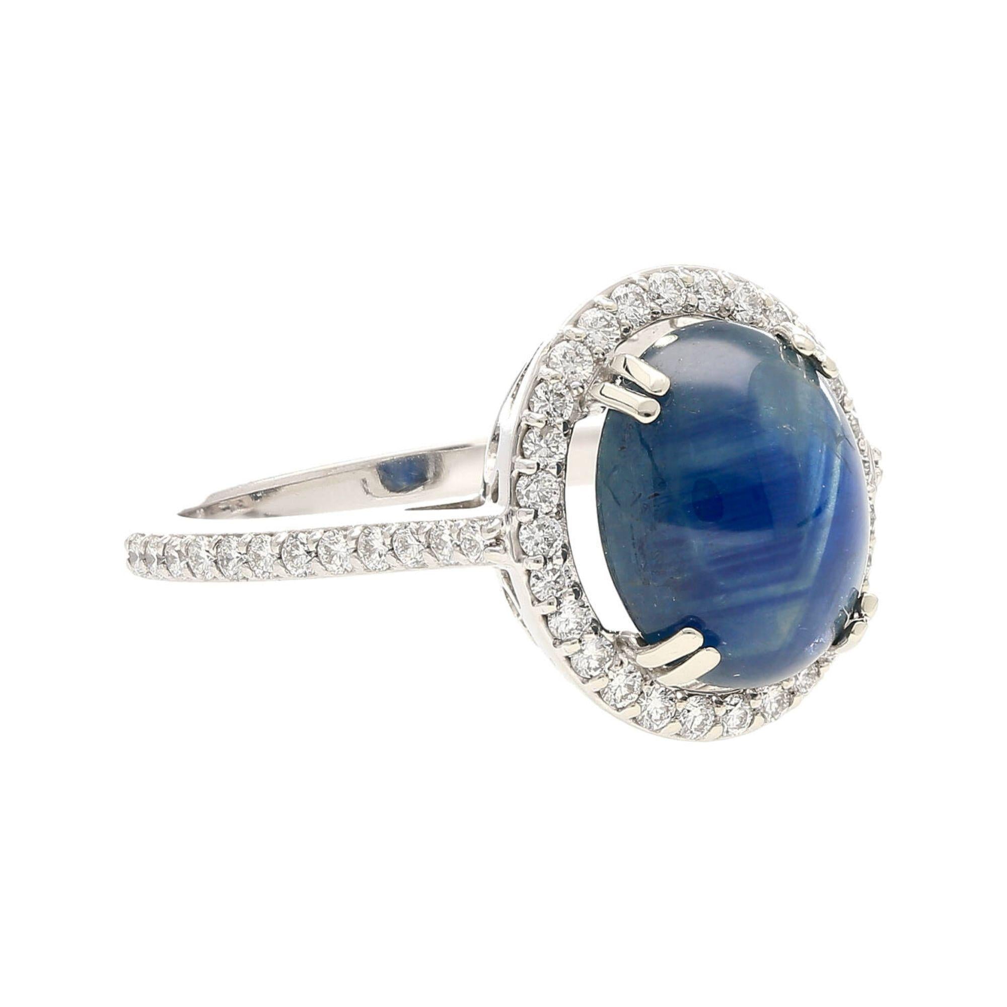 The 14K white gold setting features a four-prong basket that raises the oval cabochon star sapphire above a continuous oval halo of pave-set round brilliant diamonds that perfectly trace the outline of the center stone. The slim pave diamond shank flows seamlessly into the halo frame, extending the diamond coverage down the band for a polished, cohesive look. The all-white gold construction allows the deep blue of the sapphire and the bright sparkle of the diamonds to express themselves fully without visual interference from warm-toned metal.