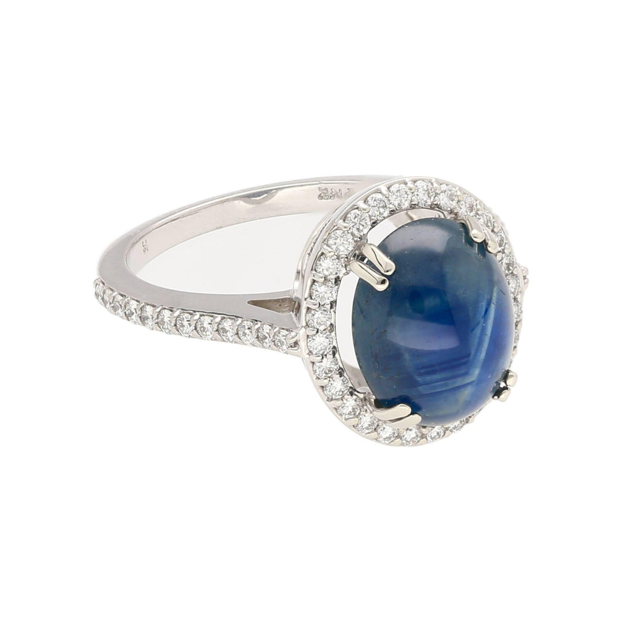 Natural blue star sapphire oval cabochon of approximately 2.80 carats set in a four-prong 14K white gold halo ring, encircled by 52 round brilliant diamonds totaling approximately 0.50 carats in a full diamond halo and pave shank.
