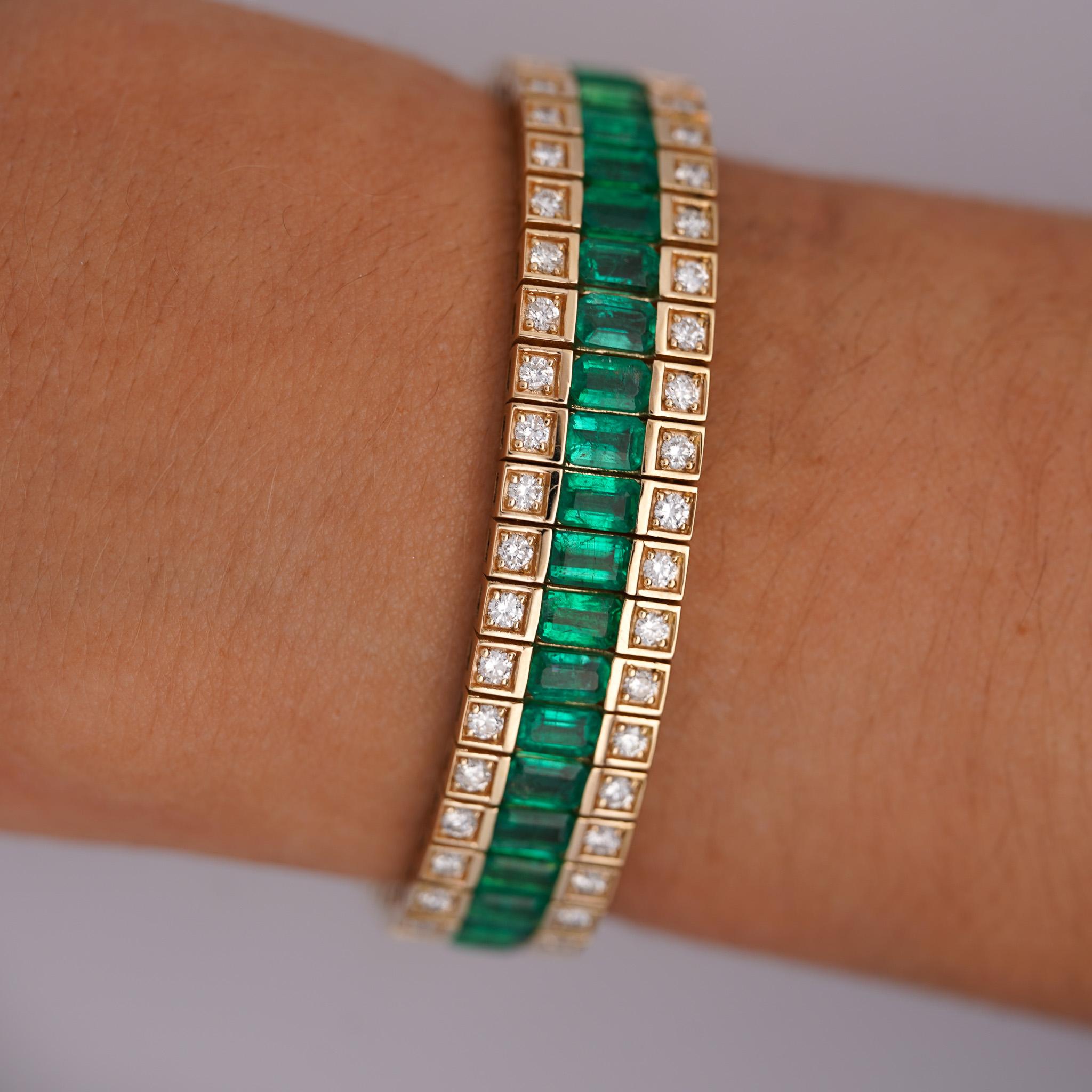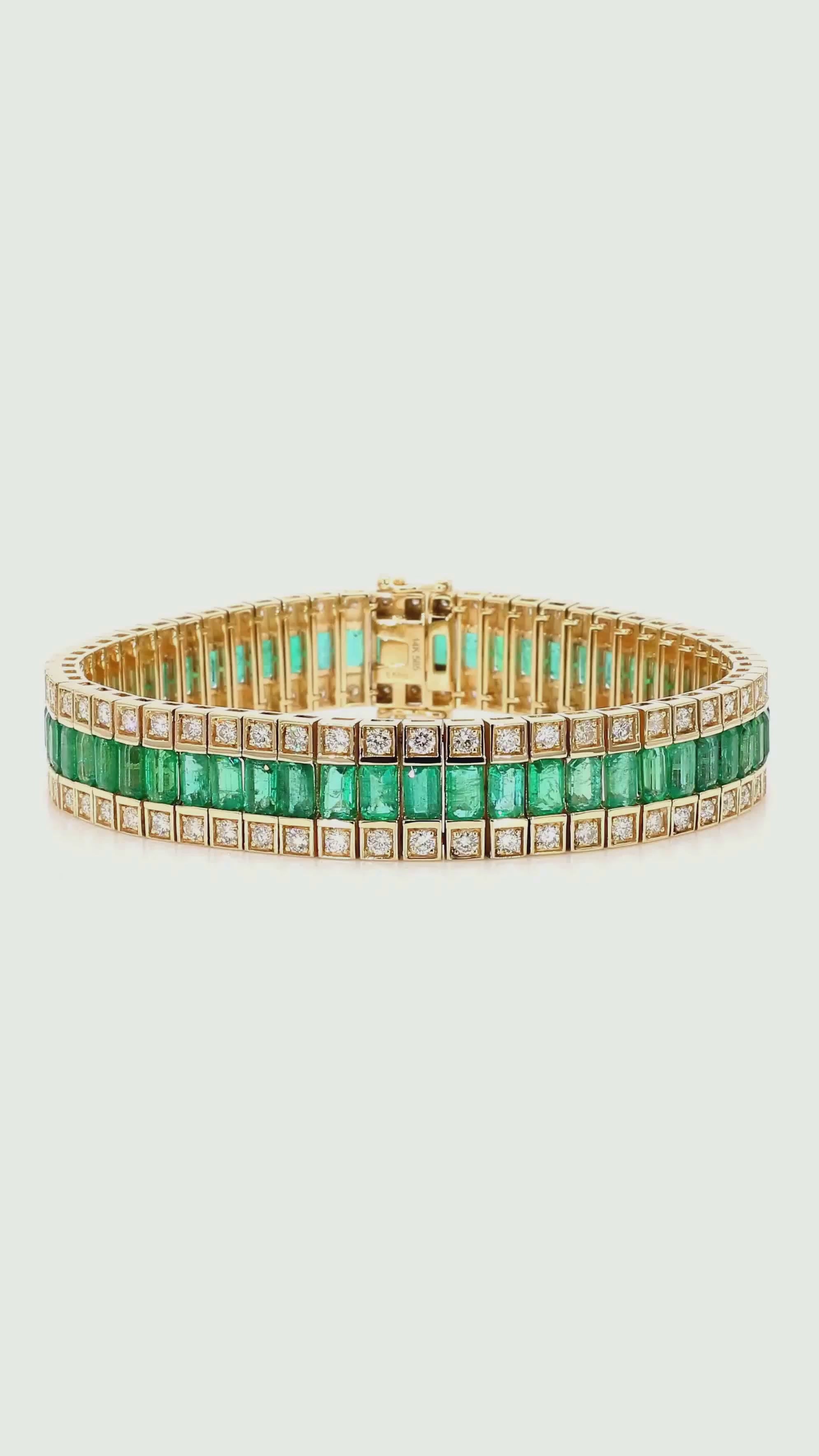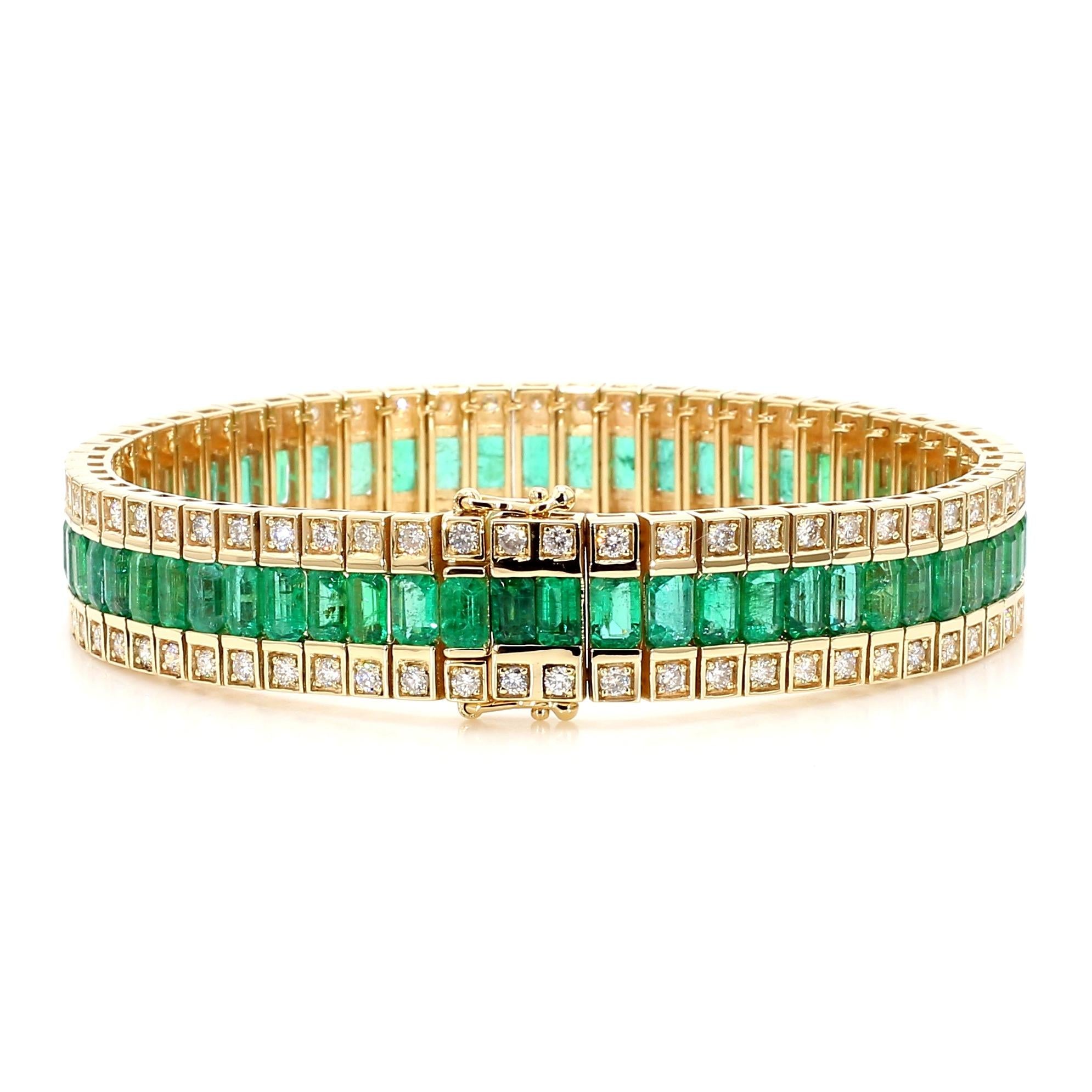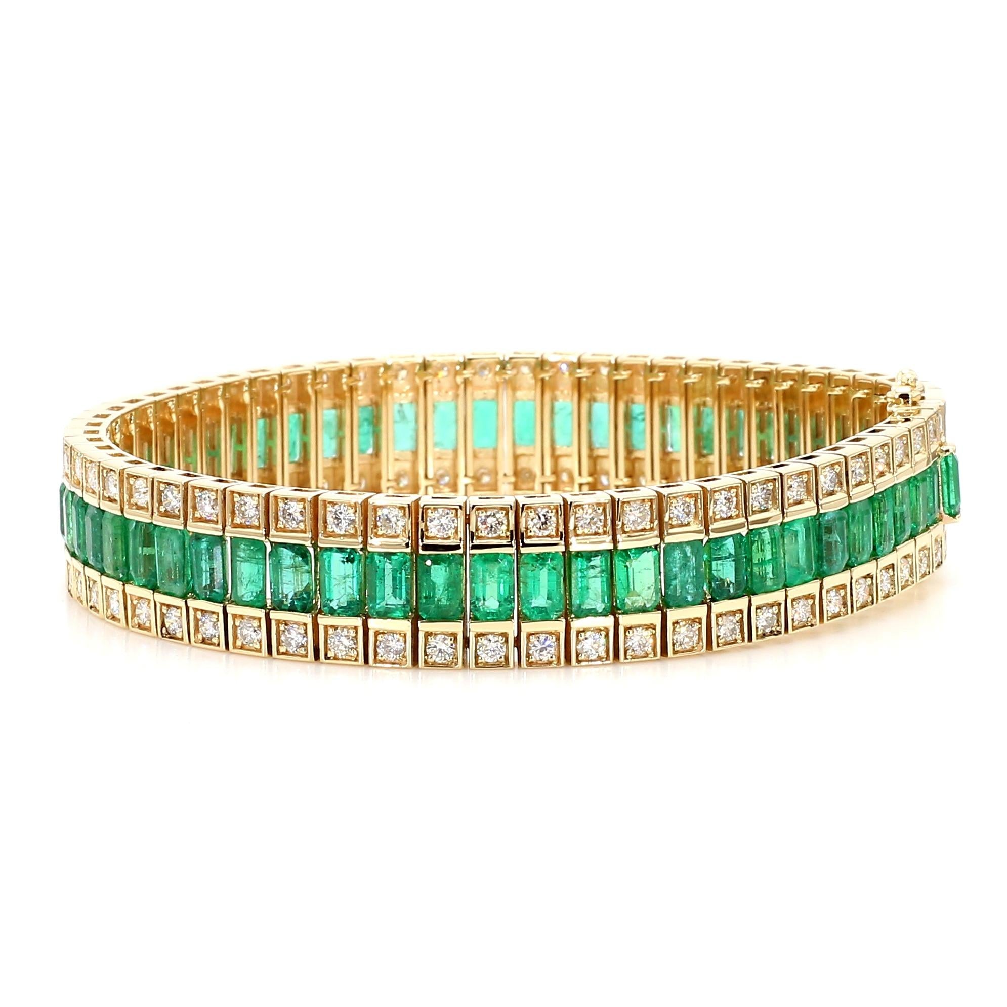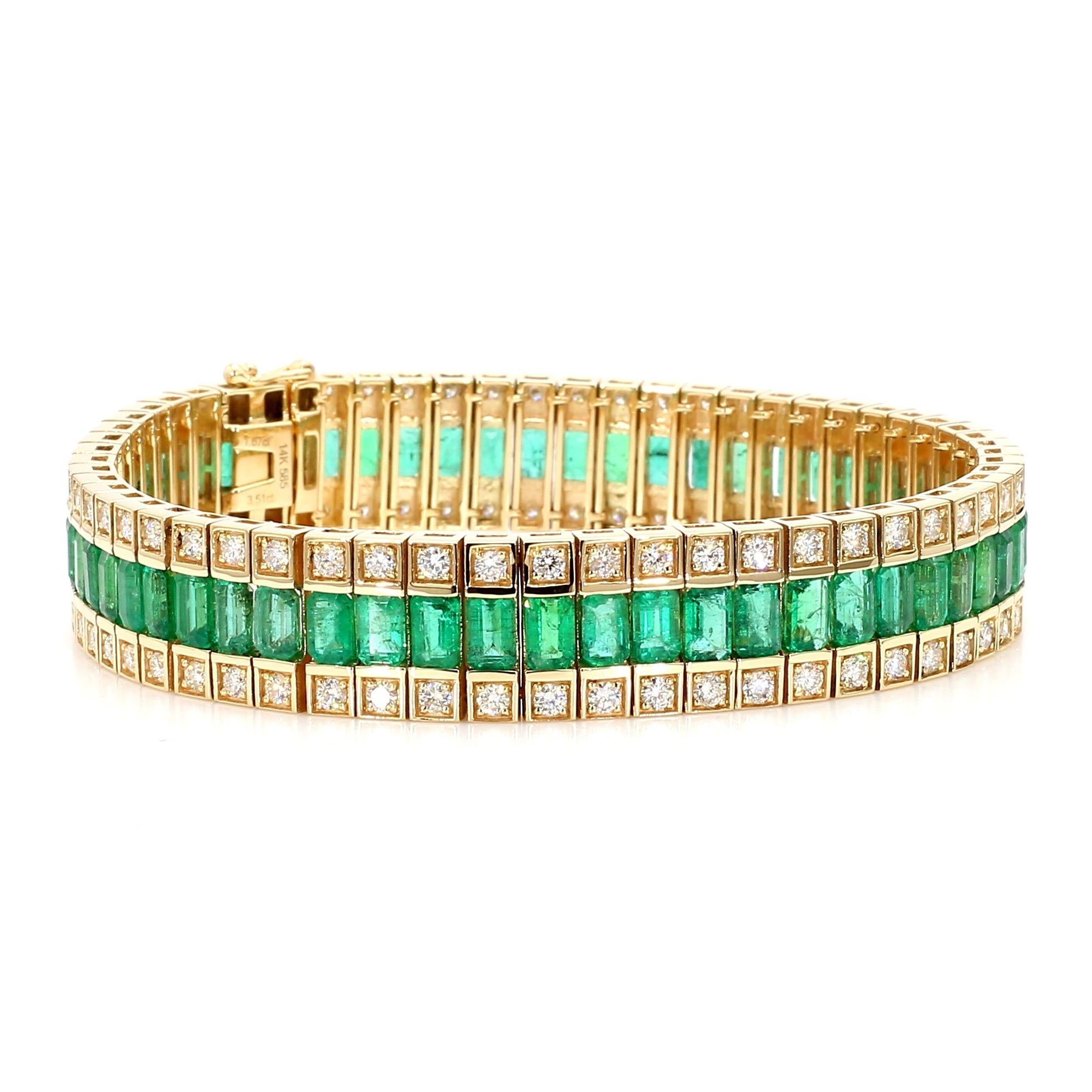 The bracelet is architecturally structured as three perfectly parallel rows — the center row houses channel-set emerald cut green emeralds in a continuous unbroken line, while the top and bottom rows each feature individually bezel-set round brilliant diamonds in square yellow gold frames, creating a grid-like geometric composition that is bold, structured, and luxurious. The box clasp with double safety latch is integrated seamlessly into the three-row design with matching emerald and diamond settings on the clasp face, maintaining the bracelet's visual continuity all the way around the wrist. At 42.67 grams of solid 14K yellow gold with an 11.5mm width, this bracelet is a genuinely substantial fine jewelry piece with significant precious metal weight and gemstone content.